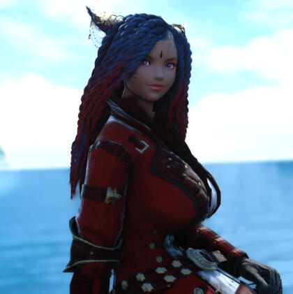 Nickname: XyGender: FemaleRace: Miqo'te, Keeper of the Moon.Age: 29 MoonsHeight: 5 ft 7" [1.7018m]Weight: 9st,2lbs [128 lbs]Hair: Dreads, Blue with Red Ends, Just below shoulder length.Skin: Light Golden Brown, Beauty mark on left cheek bone.Distinguishing marks: Scar on stomach and Back, very light scar on thigh, tattoo up her spine.Eyes: Bright Light Violet, Circular Irises, Long dark eyelashes.